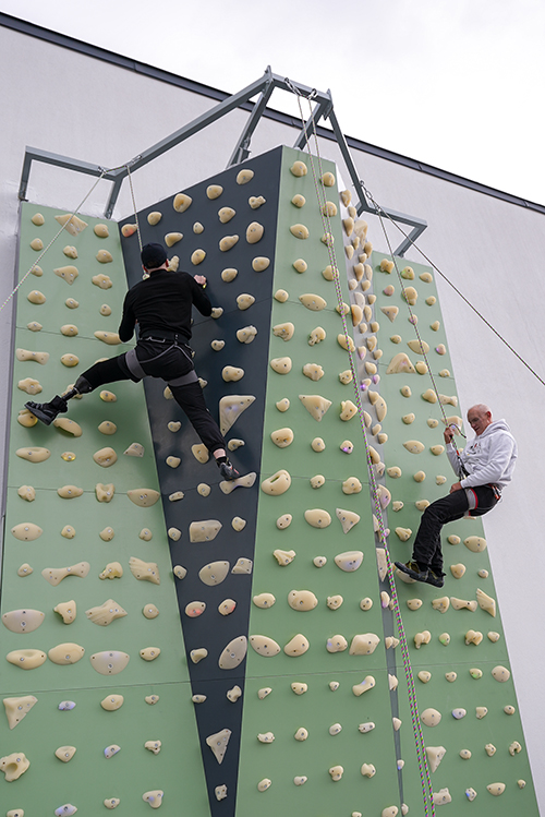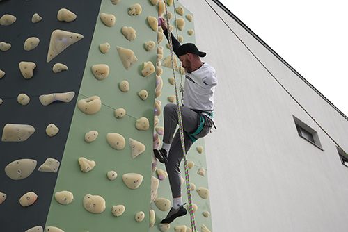 відкритим небом стіни для скелелазіння в центрі Superhumans, на яку успішно піднялися